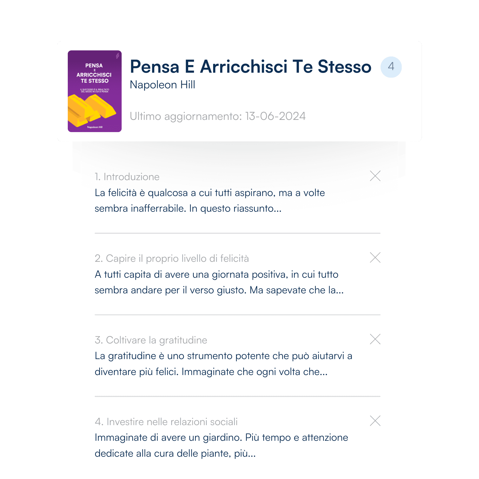 Flashbook crea riassunti di libri di auto-aiuto. Questi libri trattano di: mentalità, imprenditorialità, finanza personale, investimenti, comunicazione, positività, salute e altro ancora. I nostri riassunti sono realizzati in modo da poter essere letti o ascoltati in 15/20 minuti. Dopo aver letto o ascoltato i nostri riassunti, potete essere certi di aver letto o ascoltato tutte le informazioni importanti!