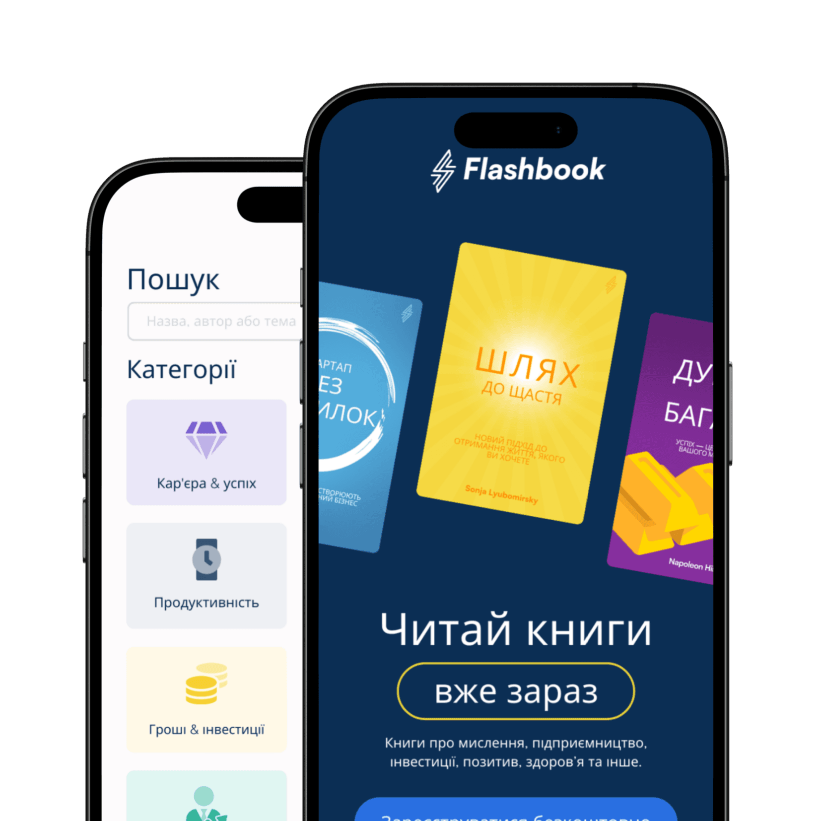 Flashbook створює резюме книг з саморозвитку. Ці книги охоплюють: мислення, підприємництво, особисті фінанси, інвестиції, комунікацію, позитив, здоров’я та інше. Наші резюме створені так, щоб їх можна було прочитати або прослухати за 15/20 хвилин. Після прочитання або прослуховування наших резюме ви можете бути впевнені, що отримали всю важливу інформацію!